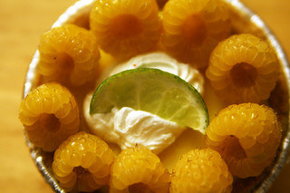 yellow raspberries, lime garnish,Yet, in spite of the oncoming harsh weather, I found one last summer treat waiting for me and my husband to share.  The young, yellow raspberry plants we planted this spring are bearing fruit!  They are golden and melt in our mouths with the sweetness of honey.  Wow!  What a treat.