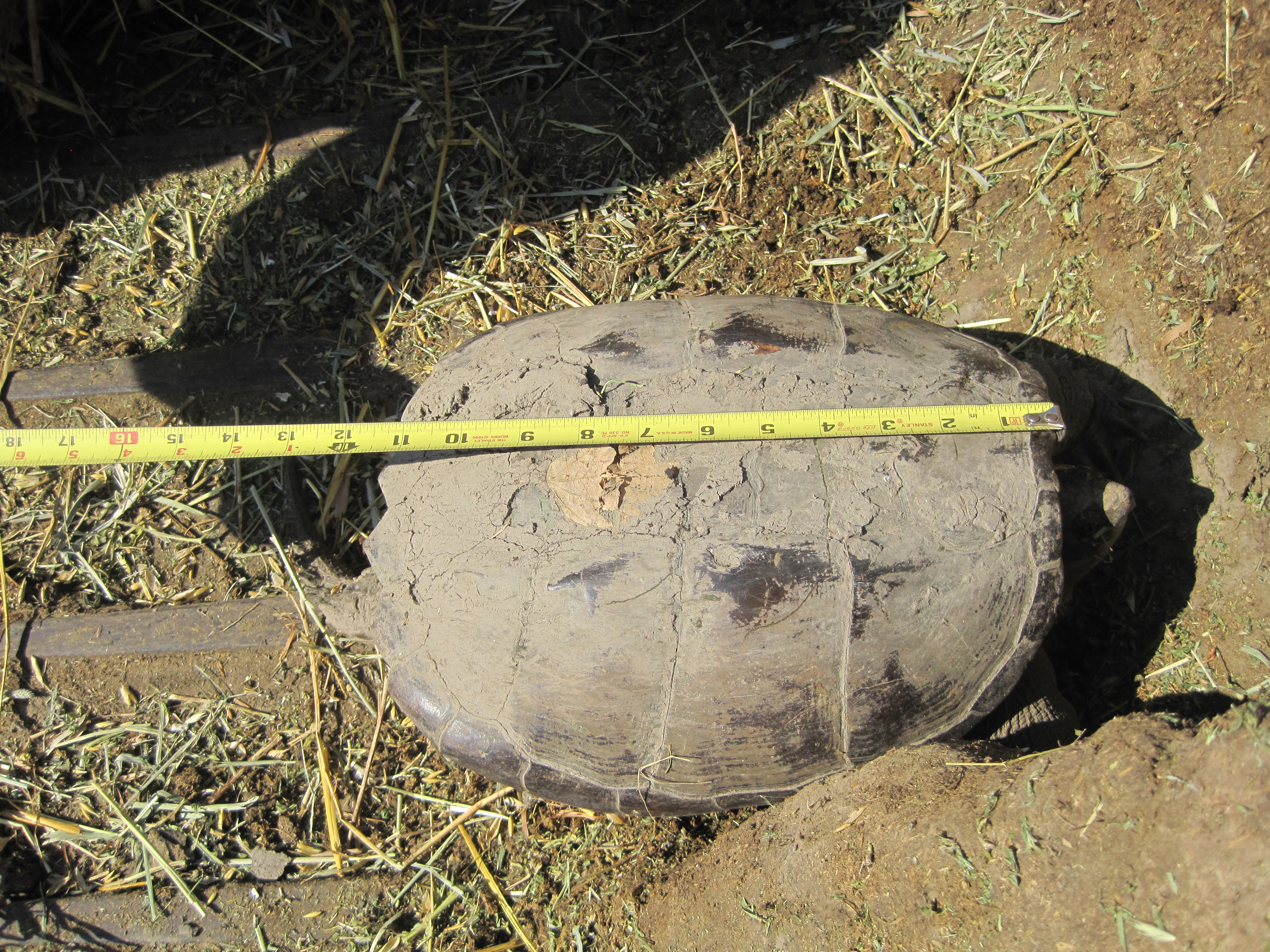 Turtle Shell, tape measure,Before freeing him, we wanted to gather some hard facts about him. To do that, my husband unloaded the turtle into a pail that was large enough for him to sit in comfortably. He took the container to the feed shed where a large scale is housed. The critter tipped the scales at 15 pounds. His shell measured approximately 12 inches long and 10 inches wide, his tail was 8 inches long, and his claws an inch long. His neck could not be measured safely and besides, he kept it tucked deeply inside his shell.